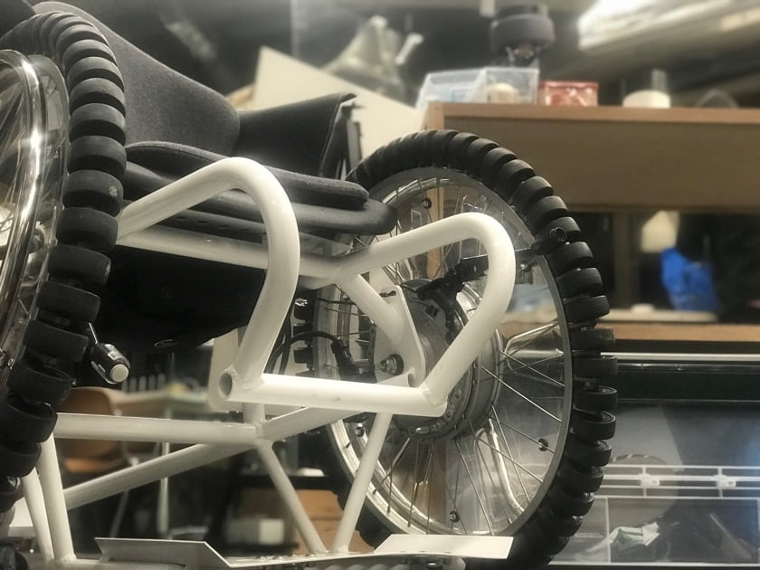 パラ陸上のレースで使用される、車イスレーサーを未来型にデザイン。VRを装着し、AD2100年のTOKYOを走り抜ける、エンターテインメント。左右のタイヤに付いているハンドリムを回す速さによって、VRの中の映像も疾走していきます。