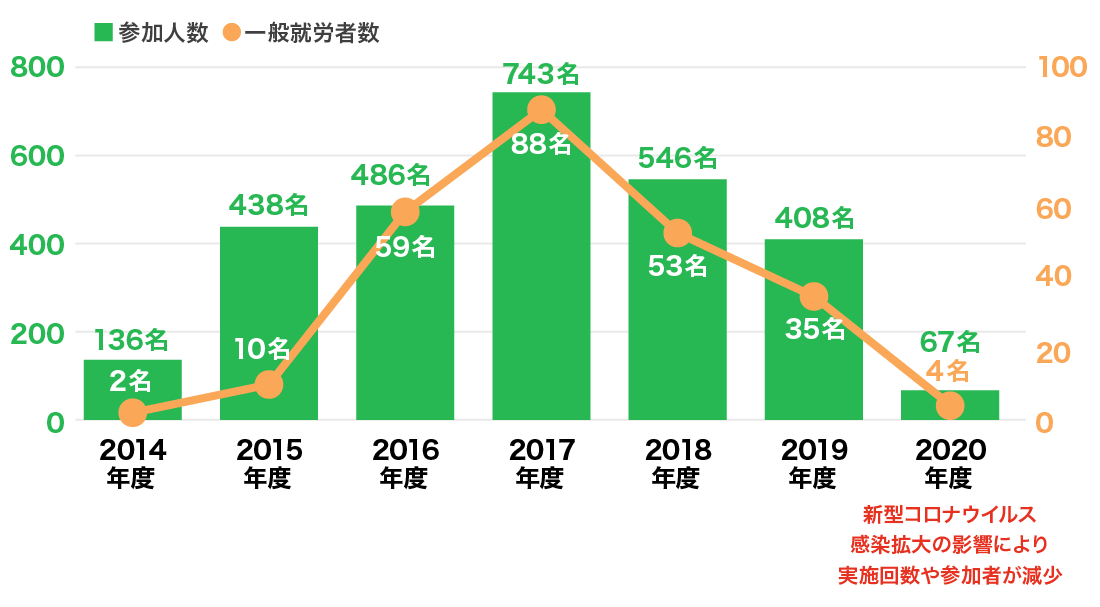 川崎市内だけでも、協定締結後の2014年7月〜2021年3月までに、304企画を実施。延べ参加人数は2,824名となっており、就労体験を経験した後、福祉事業所に通いながら一般就労を実現し、社会参画を果たした人数は251名にのぼります。また一般就労ではなくてもアルバイトをスタートしたりなど、小さなステップアップも多く確認できており、社会参画や就労に向けた “モチベーション” を高める施策としても着実に成果を上げています。